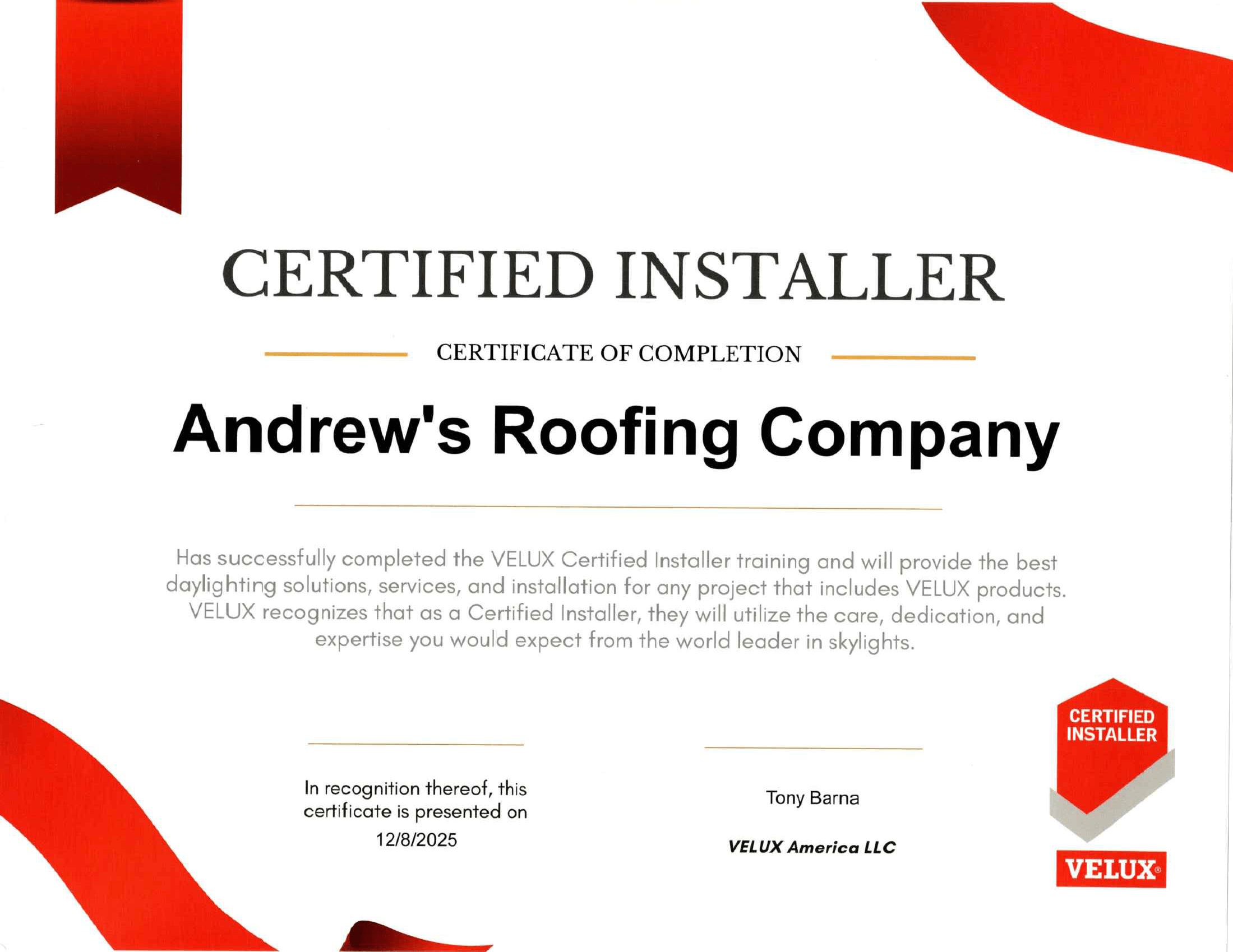 As one of only two VELUX Certified Skylight Installers in the entire Des Moines metro area, Andrew’s Roofing Company is proud to offer expert skylight installation backed by the industry’s most trusted name. Our VELUX certification means we meet the highest standards for product knowledge, installation quality, and customer satisfaction. When you choose us, you’re getting professionally trained specialists who install VELUX skylights and sun tunnels the right way, ensuring long-term performance, energy efficiency, and leak-free protection for your home.